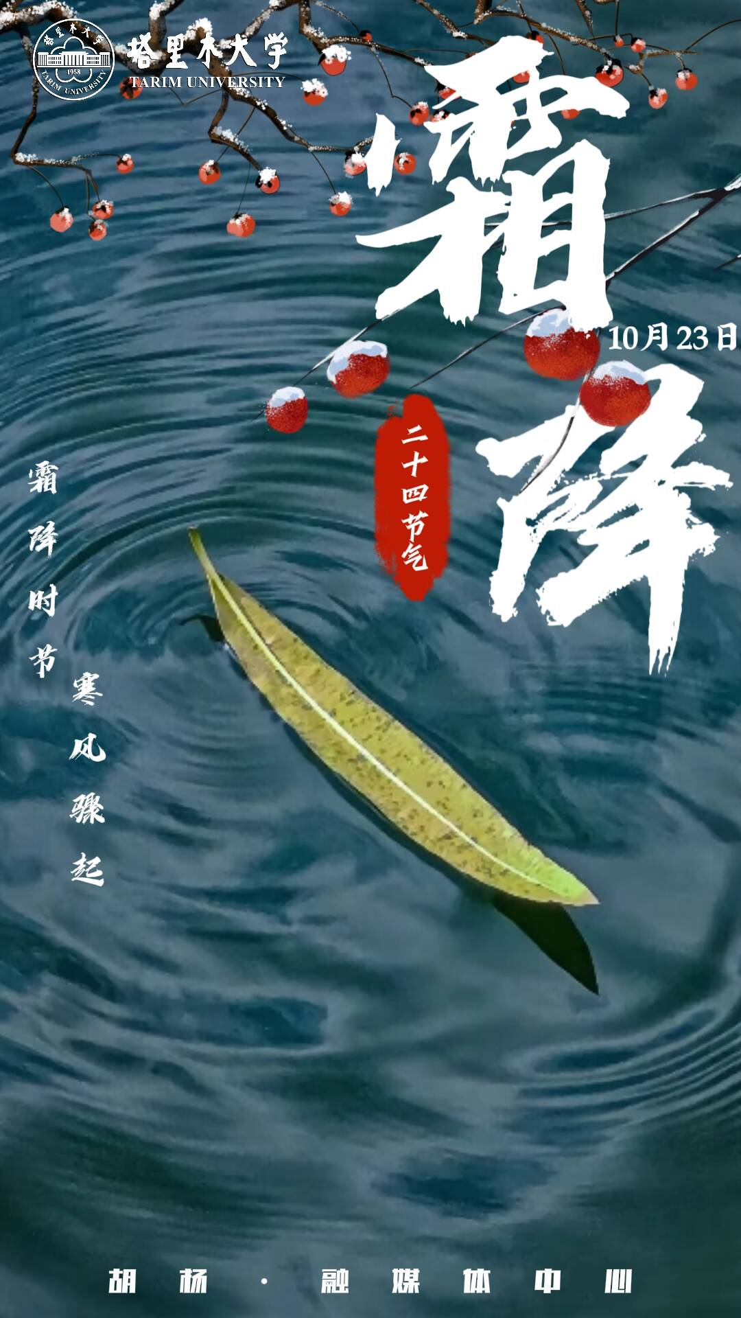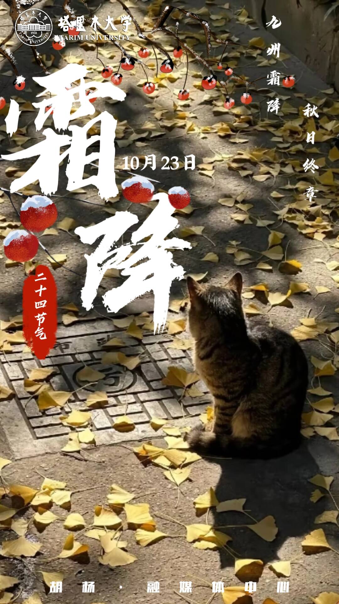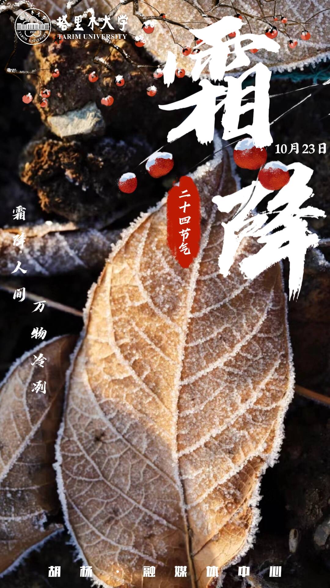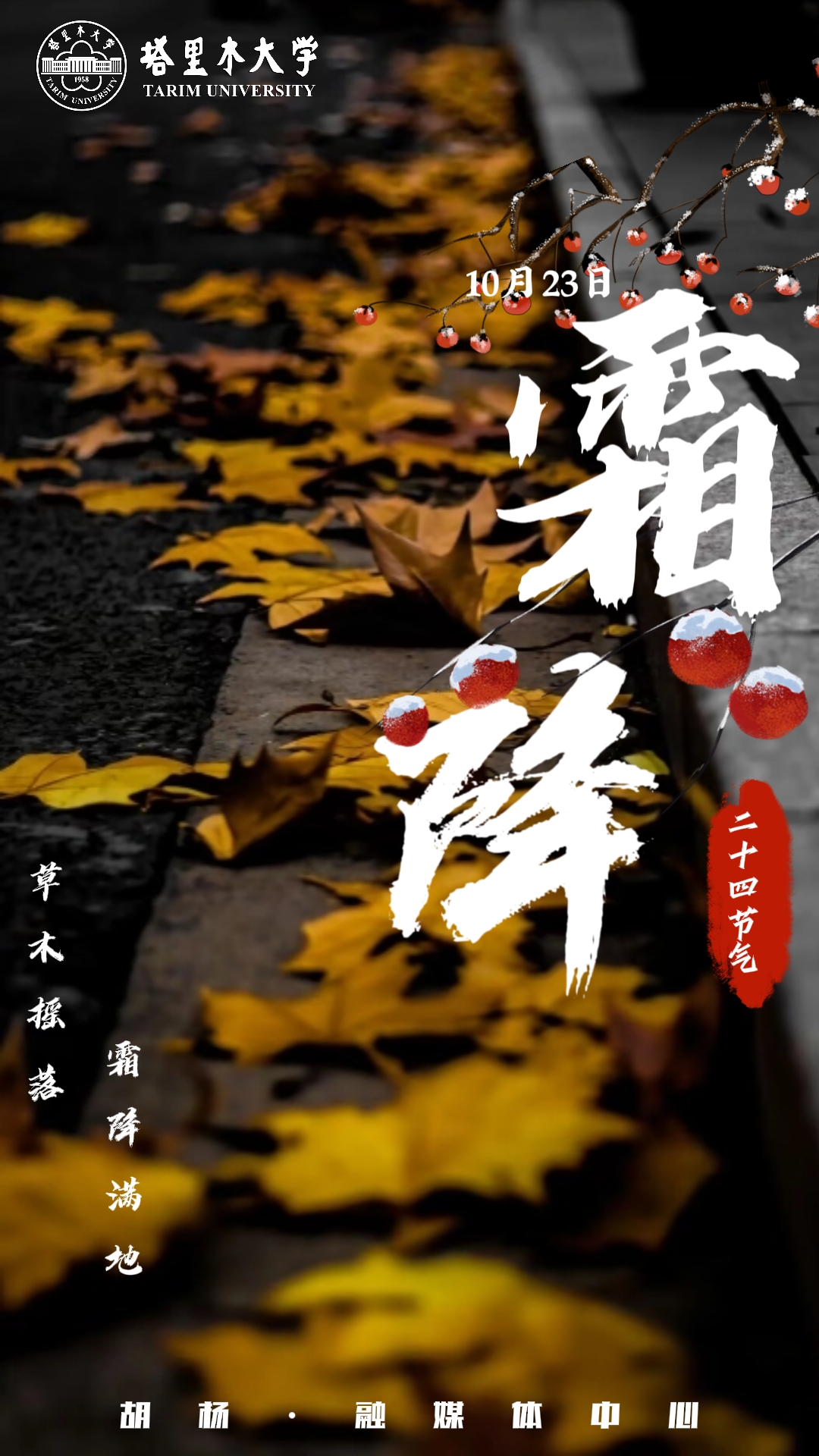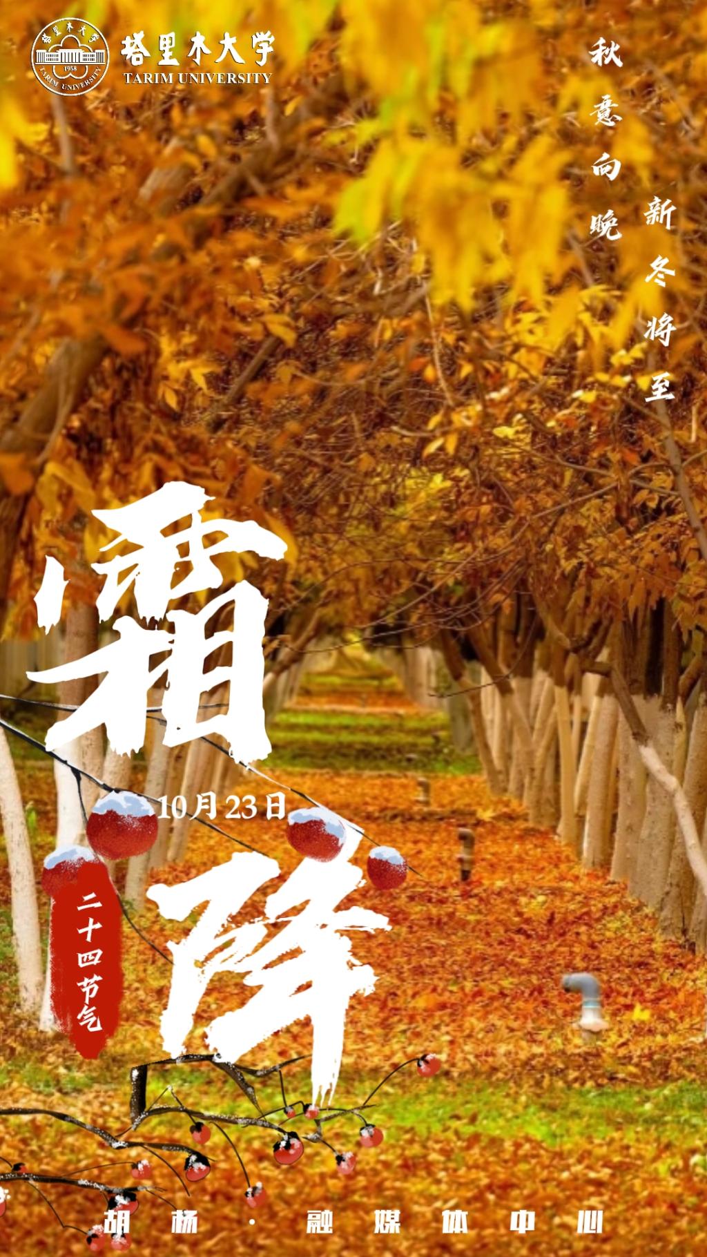 霜降,二十四节气之一,每年公历10月23日左右,霜降节气含有天气渐冷、初霜出现的意思,是秋季的最后一个节气,也意味着冬天的开始。霜降时节,塔大浸染金色风韵,迎来秋收冬藏,校园处处显露大自然赋予的神奇色彩。