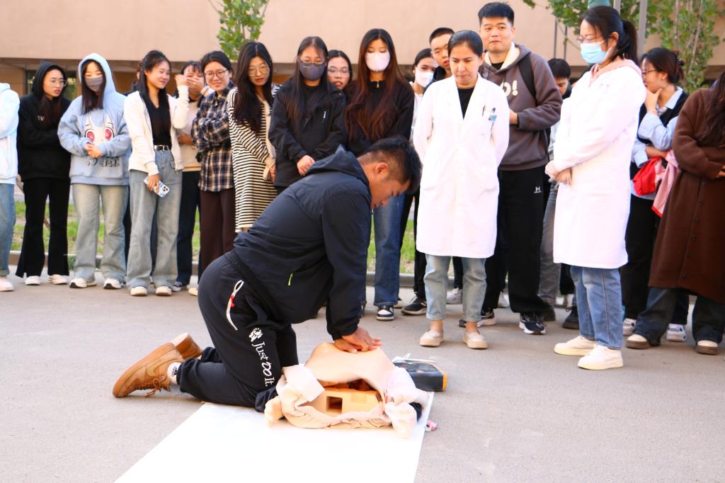 保卫部消防工程师为大家讲解了消防安全知识、教授同学们正确使用消防器材等,并示范演示了在安全环境下模拟火灾发生时,紧急疏散和安全逃生的方法和要领。校医院医护工作者实景演示了心肺复苏和AED的使用,帮助同学们掌握关键急救技能。