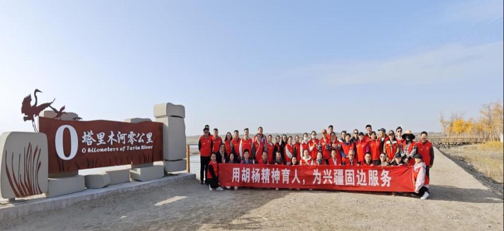 专题党课后,党员干部教师们进入塔河源胡杨林中,近距离感受胡杨的生命顽强和扎根奉献。在塔里木河“0”公里处感受三河汇聚的“母亲河”孕育出的沙漠绿洲,感慨胡杨精神赋予南疆大地的神奇魅力,“用胡杨精神育人、为兴疆固边服务”的办学特色浸润每位教师的心中。