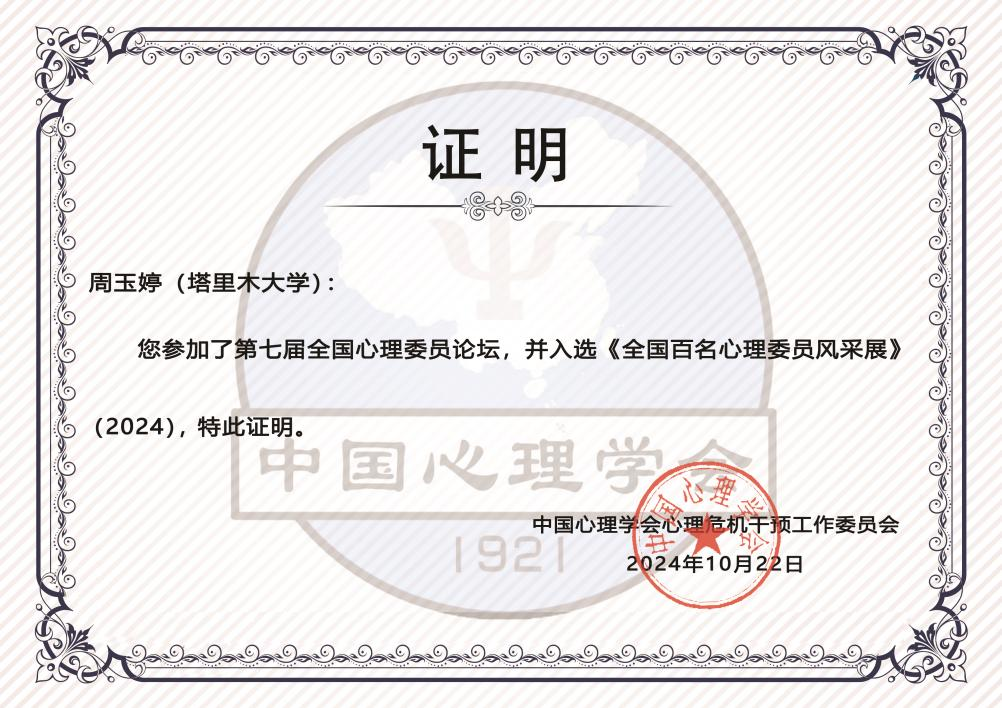在担任心理委员期间荣获全国百佳心理委员、兵团心理技能辅导大赛优秀奖。组织开展心理漫画大赛,把失落换成花等趣味活动。在5.25心理健康教育月带领大家参加各项活动,取得心理剧、短视频大赛一等奖,风筝制作大赛二等奖。