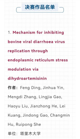 接下来的整整一个月时间里,高进东团队便开始设计撰写墙报。他们的研究立足“把健康的牛肉牛奶送到人们的餐桌”这一理念,通过大胆采用中草药双氢青蒿素(DHA)这种媒介,以减少使用抗生素、抗病毒药物的使用为抓手,改善在治疗牛病毒时由于抗生素等药物导致牛腹泻的现实难题,既解决了牛的健康治疗方法问题,又降低了滥用药物的风险,还推进了中草药在畜牧兽医界的应用。