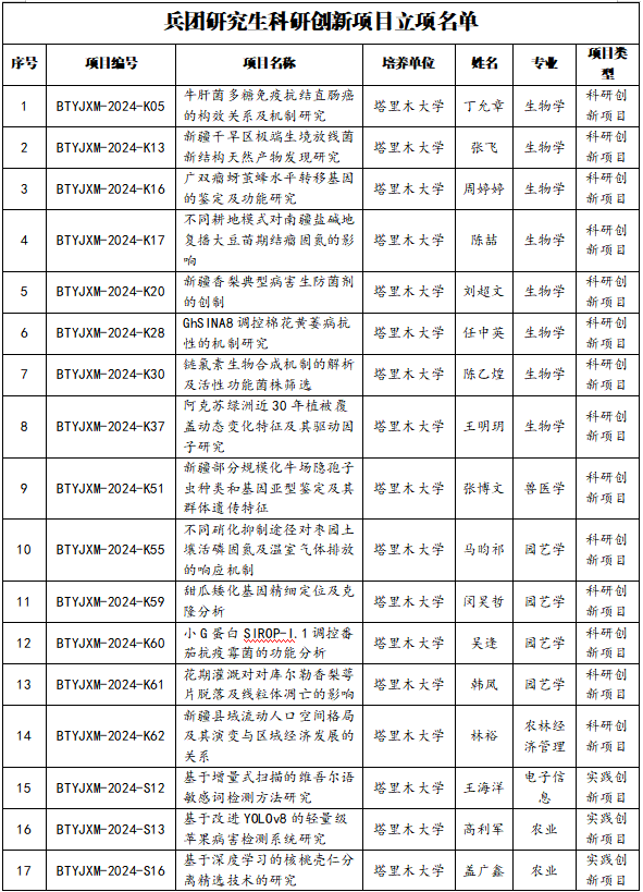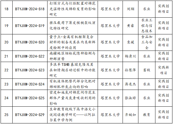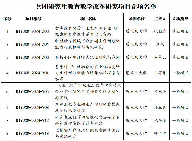 12月25日,兵团教育局公布了2024年兵团研究生教育创新计划项目立项结果。beat36533个项目获批立项,其中,研究生教育教学改革研究项目立项8项,研究生科研创新项目立项25项。