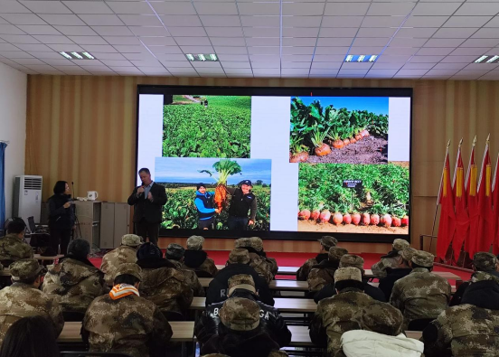 团队成员组织开展了“饲用甜菜种植技术培训会”,邀请新西兰林肯大学GIBBS STEVEN JAMES教授详细介绍了新西兰畜牧业的发展和饲用甜菜的种植情况。培训结束后,24团7连职工说:“通过今天的培训,让我对牛、羊定期免疫和饲料营养方面有了更深入的学习。”