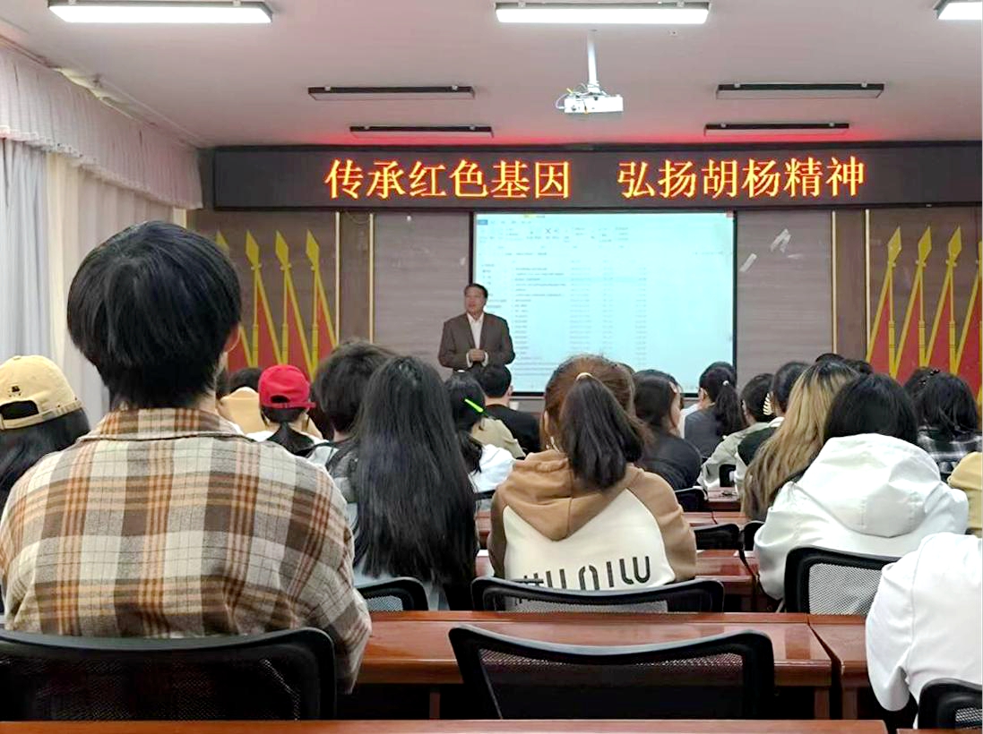 王合理以“传承红色基因,弘扬胡杨精神”为主题,结合详实的史料和生动的事迹,从胡杨精神的当代意义、学校师生践行胡杨精神的生动事迹、学校翻天覆地的变化等方面,生动讲述了胡杨师生传承红色基因,弘扬胡杨精神,为推动边疆繁荣发展贡献力量的生动事迹。