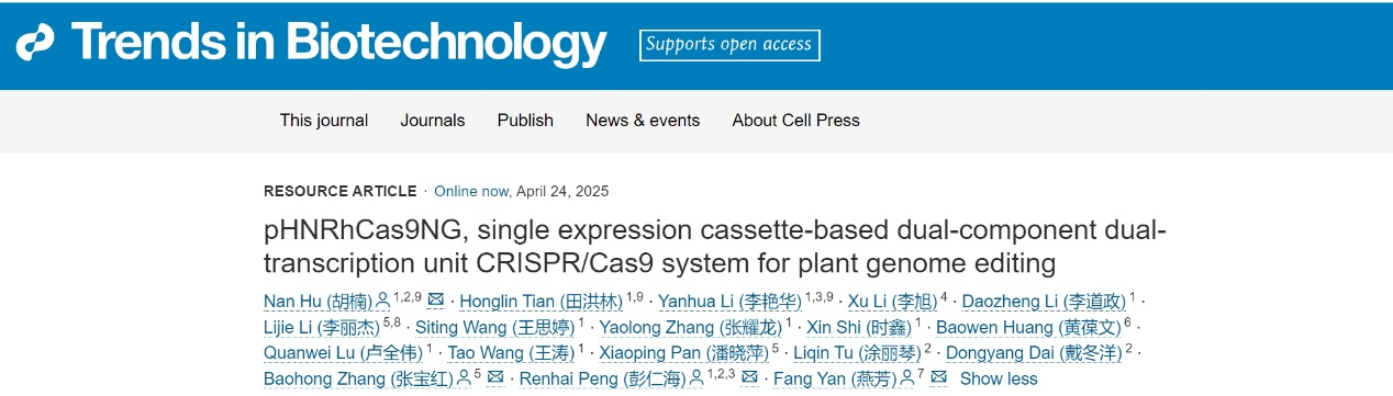 4月24日,beat365园艺与林学学院教师胡楠在Cell子刊、生物技术领域的国际顶级期刊《Trends in biotechnology》(中科院一区,IF=16.8)上发表了题为“pHNRhCas9NG, single expression cassette-based dual-component dual-transcription unit CRISPR/Cas9 system for plant genome editing”的研究成果。胡楠为第一作者和共同通讯作者,园艺与林学学院戴冬洋博士、涂丽琴博士参与该项研究。该研究得到国家自然科学基金和中国博士后科学基金等科研项目的支持。