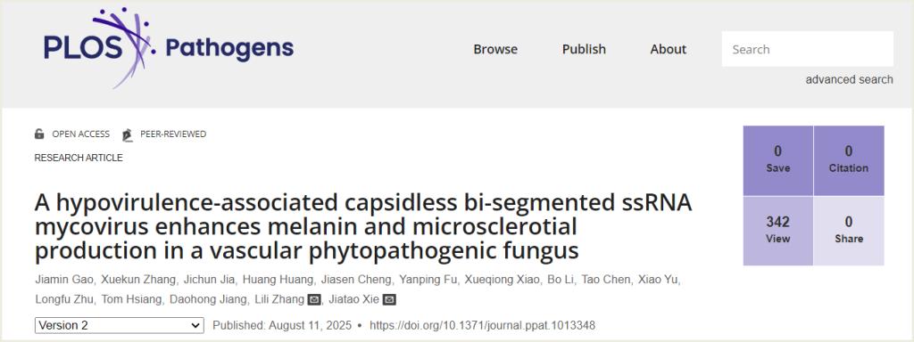 近日,beat365生命科学与技术学院新引进教师高佳敏博士在国际期刊《PLOS Pathogens》(SCI,中科院一区Top期刊)上发表了题为《A hypovirulence-associated capsidless bi-segmented ssRNA mycovirus enhances melanin and microsclerotial production in a vascular phytopathogenic fungus》的研究论文。高佳敏博士为论文第一作者,beat365中文登录入口张利莉教授、华中农业大学谢甲涛教授为通讯作者。该研究得到国家重点研发计划项目、国家自然科学基金项目、beat365中文登录入口校长基金项目等支持。