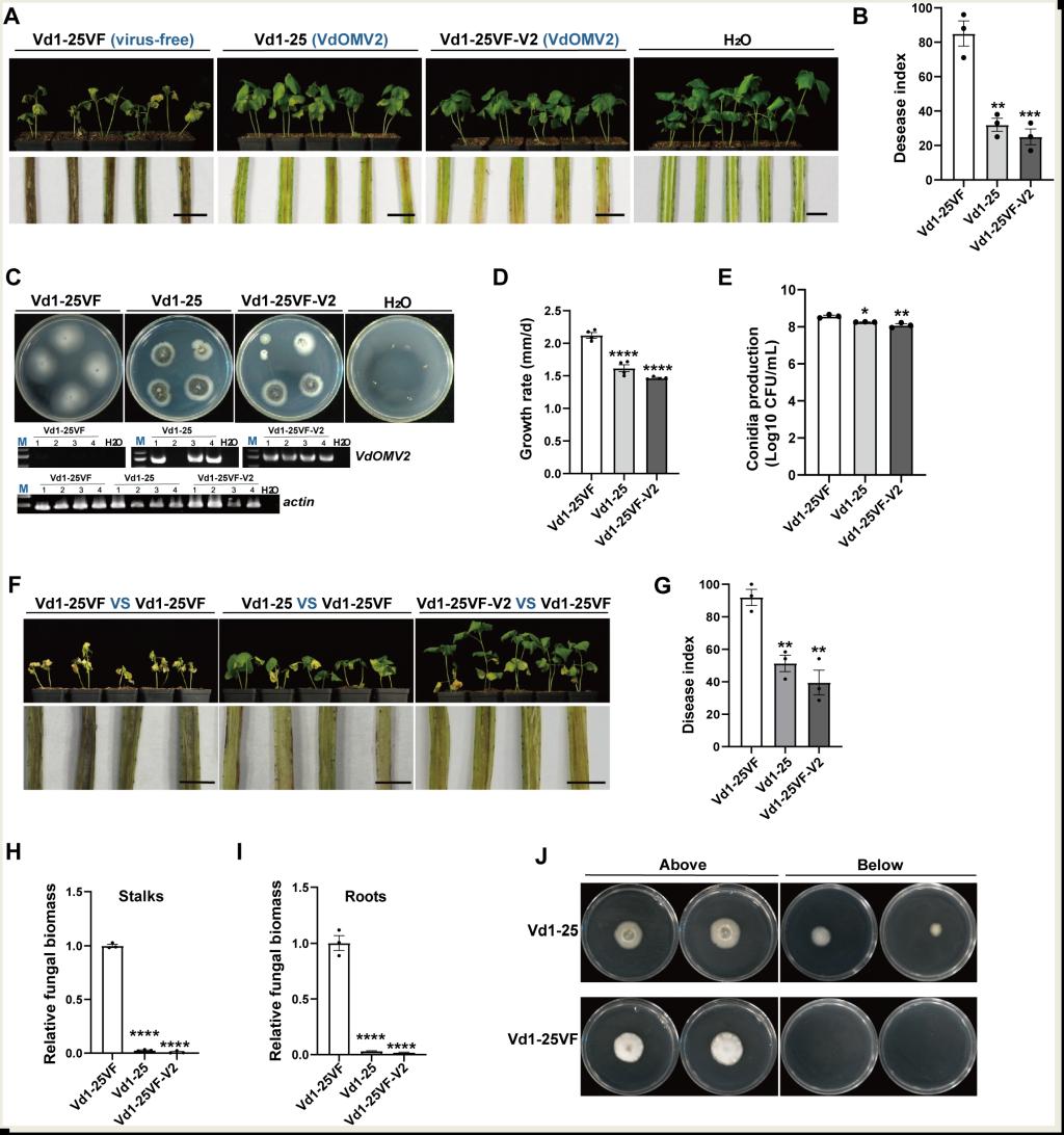 本研究对重要植物维管束病原真菌大丽轮枝菌(Verticillium dahliae)中新发现的两种无衣壳双分体单链RNA病毒——Verticillium dahliae ormycovirus 1(VdOMV1)和Verticillium dahliae ormycovirus 2(VdOMV2)进行了分子特征解析。研究发现,VdOMV2不仅能促进菌丝体向微菌核的形态转换,还可显著增强宿主在非生物胁迫环境中的生存能力。值得注意的是,该病毒在降低大丽轮枝菌对棉花侵染能力的同时,展现出对棉花黄萎病非常好的生防潜能。这种兼具低毒力特性和胁迫耐受性增强的双重效应,为包括棉花黄萎病在内的维管束萎蔫病害防控提供了全新的真菌病毒介导防治策略。