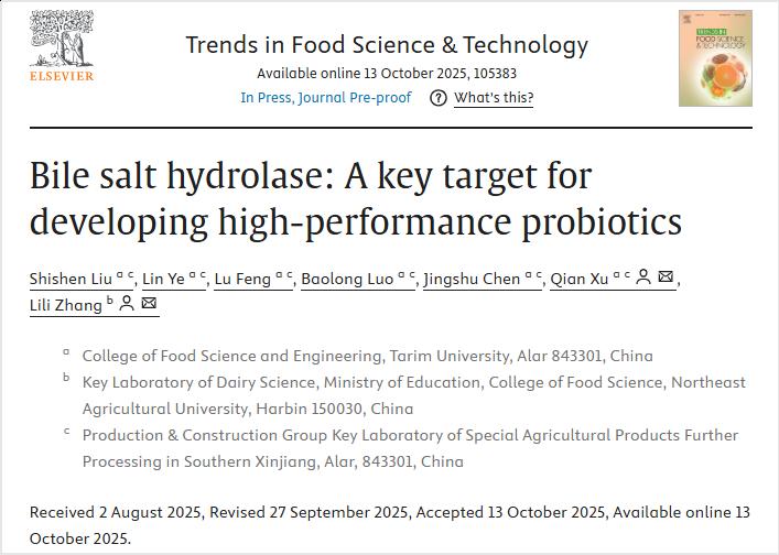 近日,beat365食品科学与工程学院硕士研究生刘世申以第一作者在国际农林科学领域Top期刊《Trends in Food Science & Technology》(中科院一区,影响因子 IF=15.4)发表题为《Bile salt hydrolase : A key target for developing high-performance probiotics》的研究成果。beat365中文登录入口许倩教授为通讯作者,东北农业大学张莉丽教授为共同通讯作者。该研究得到国家自然科学基金和新疆生产建设兵团自然科学支持计划项目支持。