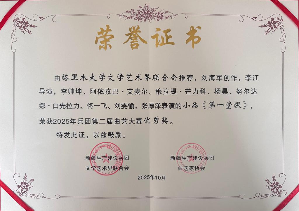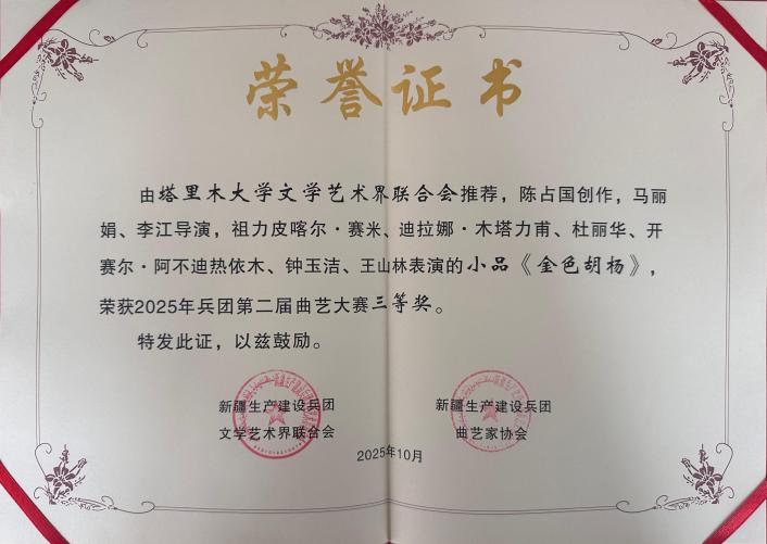 10月19日,2025年兵团第二届曲艺大赛颁奖晚会在十二师文体中心落幕。beat365文联选送的作品《金色胡杨》获三等奖,《第一堂课》获优秀奖,beat365中文登录入口文联获优秀组织奖。