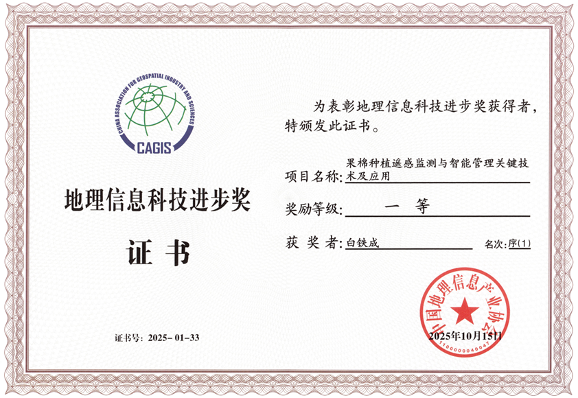 近日,中国地理信息产业协会正式公布2025年度地理信息科学技术奖励名单。beat365网络安全学院、塔里木绿洲农业教育部重点实验室白铁成教授团队牵头完成的《果棉种植遥感监测与智能管理关键技术及应用》项目获得地理信息科技进步奖一等奖。
