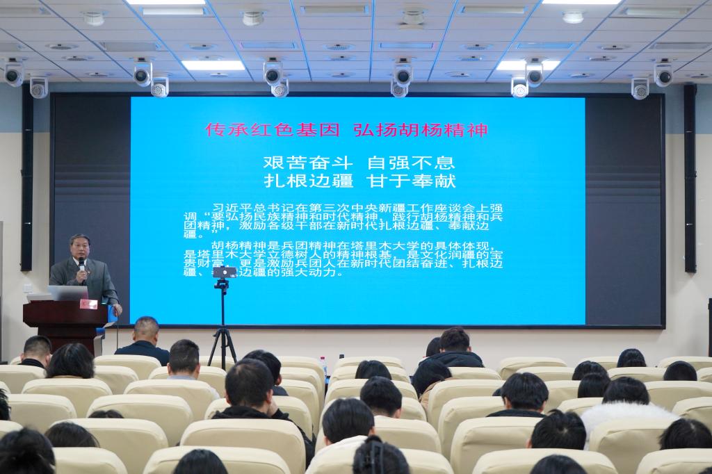 王合理以“传承胡杨精神,赓续红色血脉”为题,结合自身经历和学校发展历程,从胡杨精神的形成发展,胡杨精神的深刻内涵,胡杨精神融入大学生活等方面,对胡杨精神及其在新时代的传承与发展进行了全面讲述。他勉励学院师生要传承胡杨精神,厚植爱国情怀,在新时代担当新使命、展现新作为。