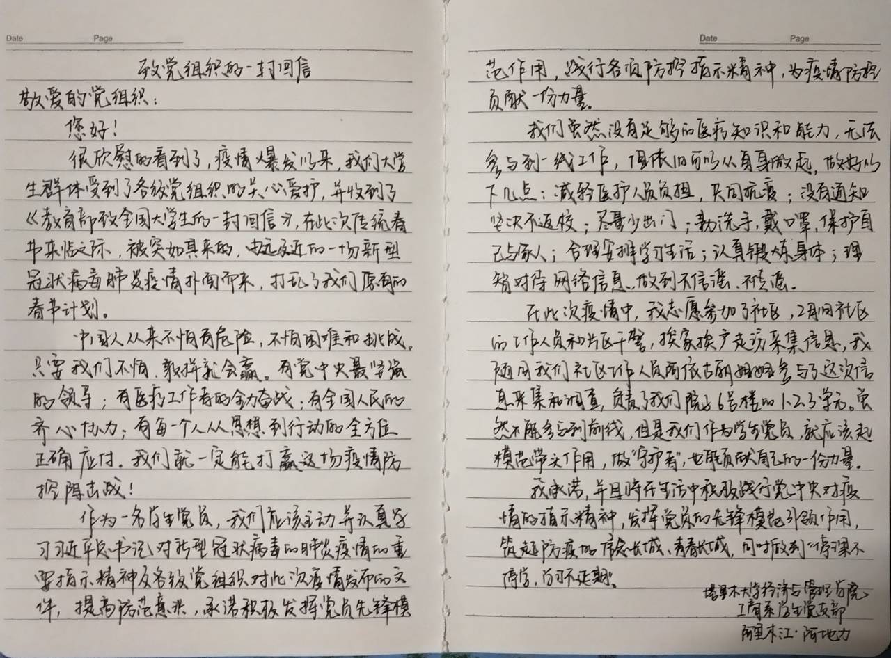 此次活动要求支部全体党员认真学习贯彻总书记重要讲话和重要指示精神,认真阅读学习学校党委关于深入贯彻落实总书记重要指示精神 加强党的领导 为打赢疫情防控阻击战提供坚强政治保证的通知、教育部致全国大学生的一封信、beat365中文登录入口致广大师生员工的一封信,在此基础上撰写一封回信交给党支部,从学生党员的身份出发,做出承诺,积极践行,为疫情防控贡献力量。