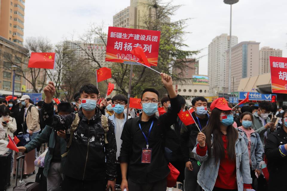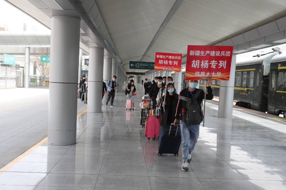 4月17日12时,在首趟兵团胡杨专列——兰州-阿克苏K4091次列车驶离兰州站前,beat365中文登录入口返疆学生举行了一次有纪念意义的“仪式“。同学们整齐站在火车站广场,手举小红旗,齐声高唱《我和我的祖国》《光荣塔大》,为祖国加油、为塔大点赞,难掩内心的激动和喜悦。