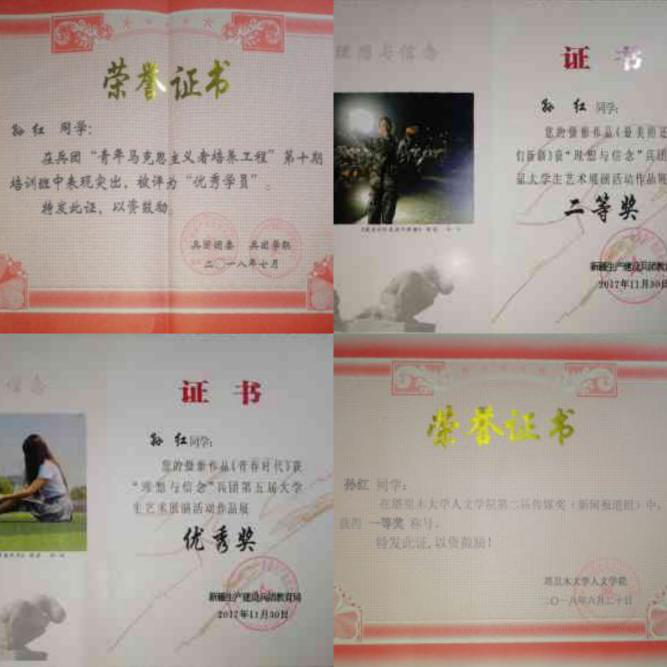 曾荣获新疆生产建设兵团大艺展摄影作品“二等奖”、“优秀奖”,人文学院传媒类“一等奖”,DV大赛“三等奖”,摄影作品正在参加“第三届全国大学生网络文化节”。曾获学校一等奖学金、二等奖学金等。