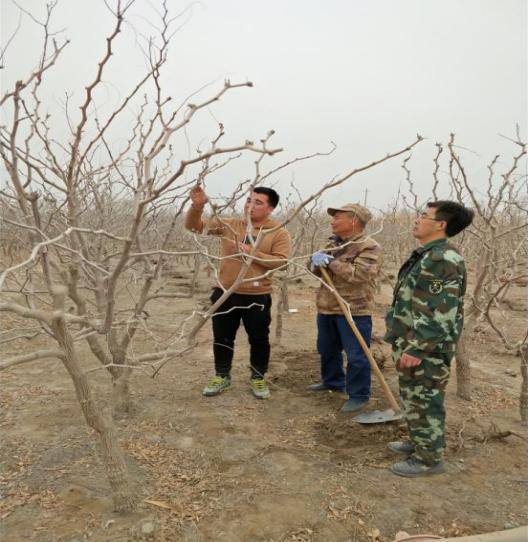 3月14日,“访惠聚”工作队科技特派员团队成员,来到连队职工困难户刘建明的枣园,了解枣树修剪过程中存在的主要问题和不足,指导枣树主干疏层形树体结构、树冠控制措施、充分利用空间、结果枝组培养与更新和施基肥改良土壤等技术措施。