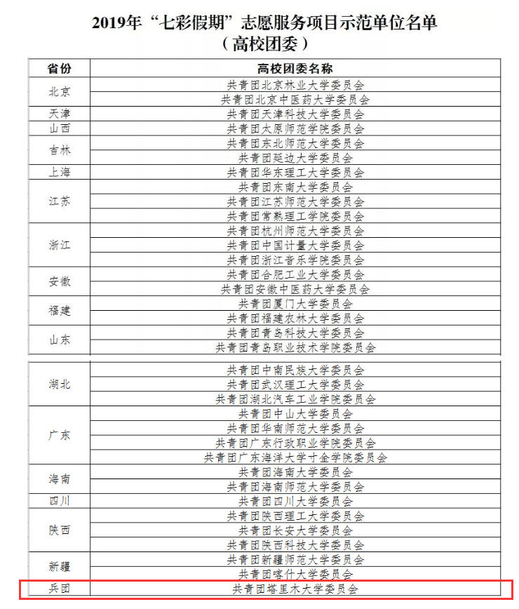 近日,由共青团中央、中央文明办、教育部、民政部、中国青年志愿者协会共同举办的关爱农村留守儿童“七彩假期”志愿服务项目表彰结果揭晓,beat365被评为2019年“七彩假期”志愿服务项目全国示范单位。此次全国共评选出69个示范单位,其中,市、县团委34个,高校团委35个,兵团仅有beat365获此殊荣。