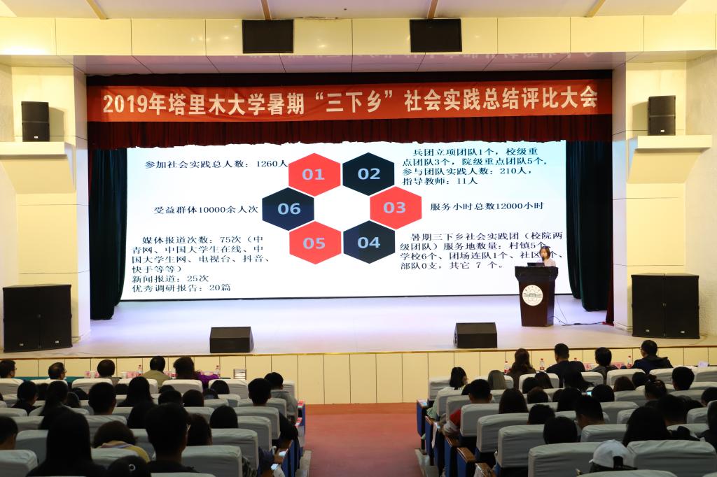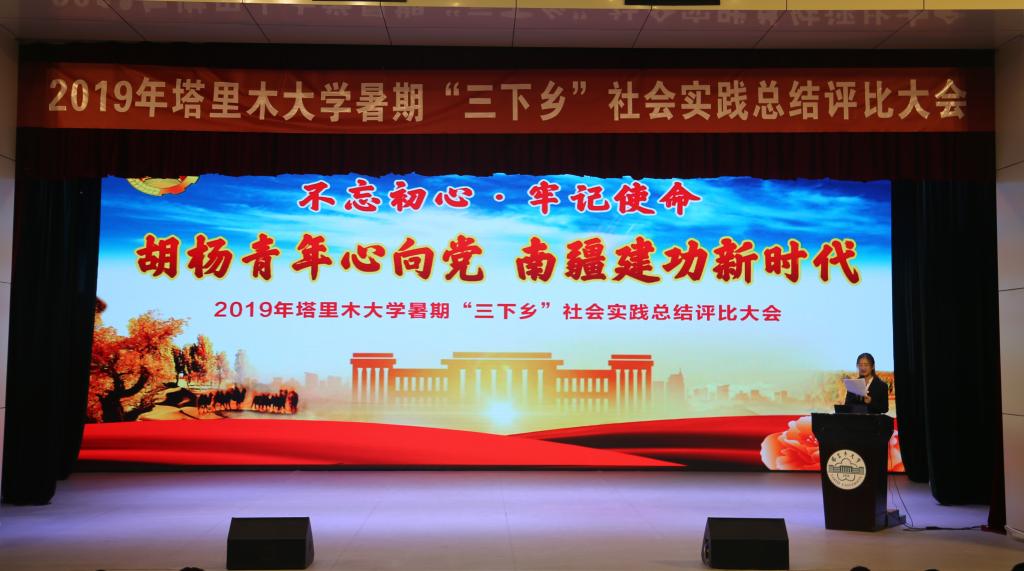 为深入贯彻习近平新时代中国特色社会主义思想和党的十九大精神,10月9日,学校在大学生活动中心召开“不忘初心,牢记使命--胡杨青年心向党,南疆建功新时代”2019年暑期“三下乡”社会实践总结评比大会。