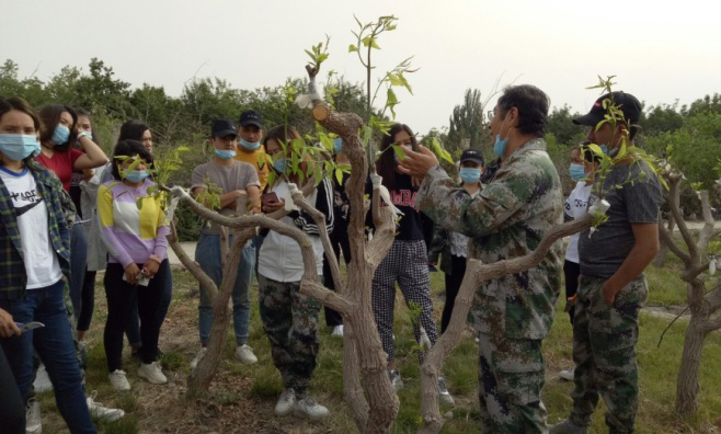 5月18日,园艺民21-1班进入毕业生产实习的第一天。植科院园艺林学系实习指导老师张琦老师、熊燕老师早晨9:30准时和同学们进入园艺试验站,张琦老师先是向同学们介绍了试验站部分枣园2020年春季高接换种的基本情况,请同学们结合观察到的嫁接枣树回忆课程相关理论知识点如:嫁接方法、嫁接要求及如何检查嫁接成活率等内容,组织同学们对嫁接树进行砧穗愈伤组织观察、砧木抹芽等操作。