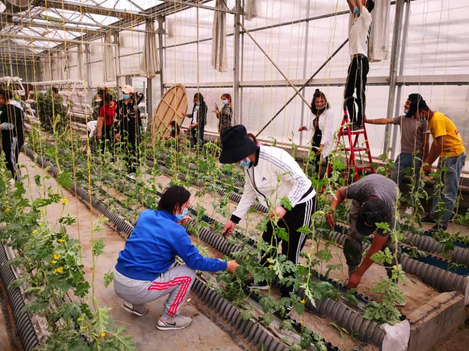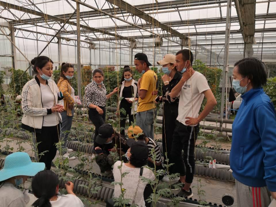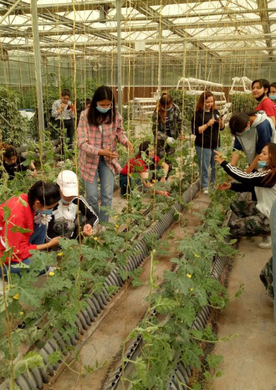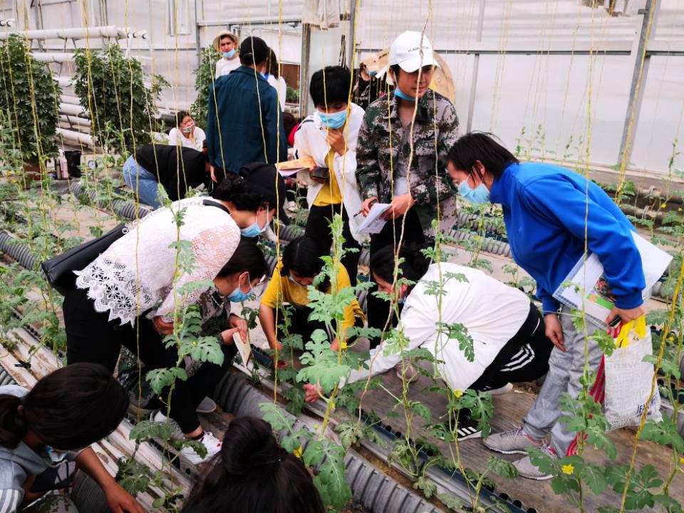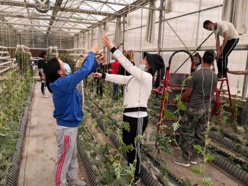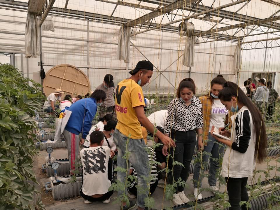 同学们随后去智能温室了解了设施无土栽培西瓜方法。园艺林学系阿依买木老师疫情期间克服困难进行了西瓜育苗工作,当天她向同学们讲解并示范了西瓜植株调整的方法,详细介绍了西瓜生物学特性调查方法。同学们在指导老师的协助下亲自操作如何打叉、绑蔓;学习如何将生物学调查与田间试验设计结合,以增加对田间统计数据资料分析的感性认识。通过这些实践与理论结合的生产实习环节,使同学们对“学以致用”留下了深刻印象。