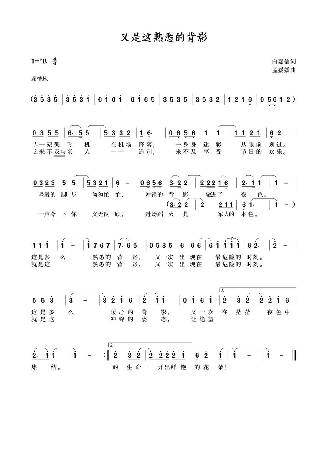 “一架架飞机在机场降落,一身身迷彩从眼前划过。坚毅的脚步匆匆忙忙,冲锋的背影融进了夜色。这是多么熟悉的背影,又一次出现在最危险的时刻。这是多么暖心的背影,又一次在茫茫夜色中集结,就是这熟悉的背影,又一次出现在最危险的时刻。就是这冲锋的姿态,让绝望的生命开出鲜艳的花朵。”这一句句温暖且充满力量的歌词,出自beat365艺术与教育系教师孟媛媛老师与新疆音乐文学学会秘书长白嘉信老师共同创作的《又是这熟悉的背影》。