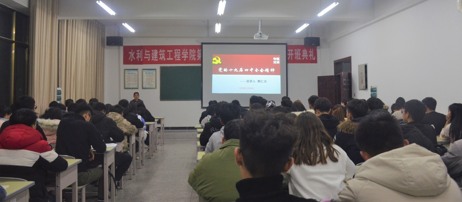 12月6日晚,水建院结合入党积极分子培训班,在工科实训楼南513室,开展党的十九届四中全会精神宣讲报告会。学院党委书记熊仁次作宣讲报告,学院第66期入党积极分子听取宣讲。