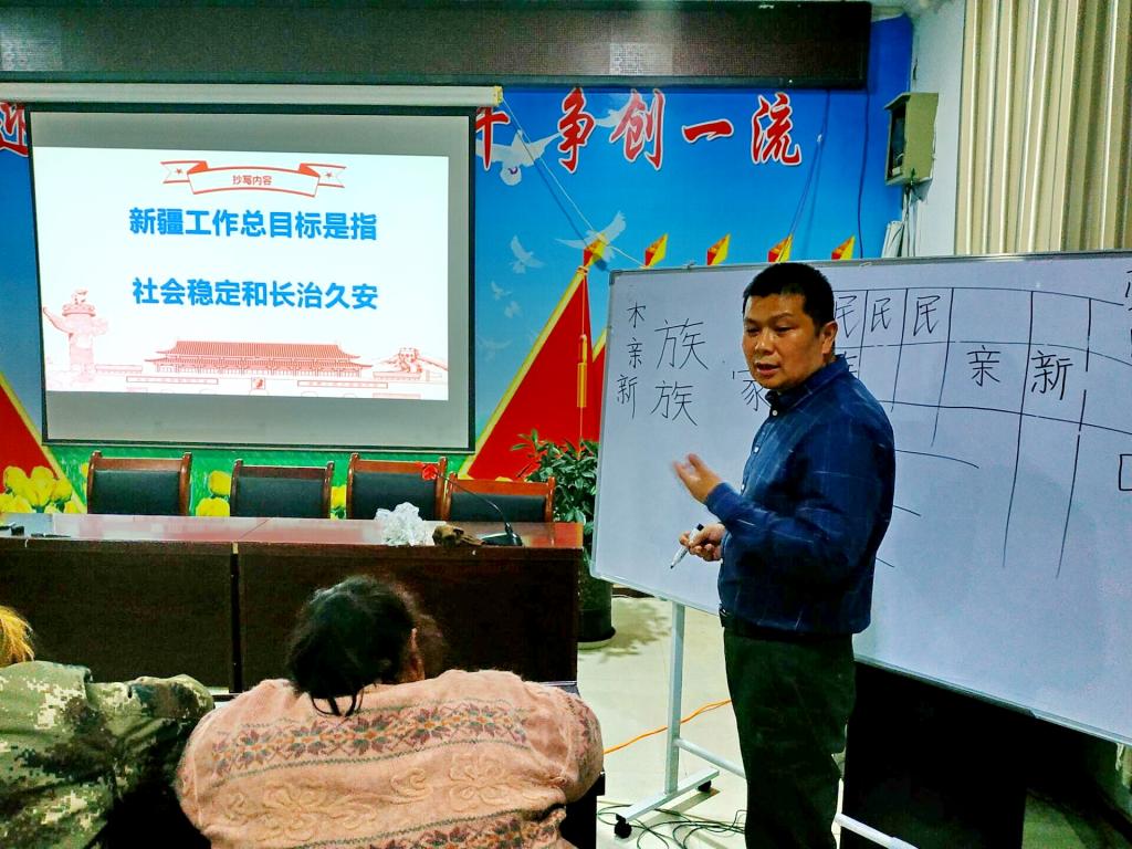 ---我们的班主任艾山江老师特别关心我们,每一次上课之前跟我们一起打球、聊天生活,还带我们一起学唱歌曲,我都学会了“我和我的祖国”、“团结就是力量”、“国歌”等歌曲,每节课上下课我们都要集体唱歌。我们在“夜校”学习很开心,艾老师“亚克西”!