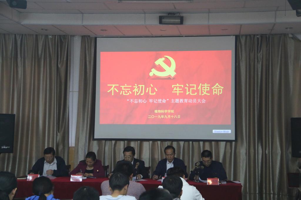 9月18日下午,植物科学学院在老植科楼四楼多功能报告厅召开学院“不忘初心、牢记使命”主题教育动员大会。学校主题教育领导小组办公室副主任、第一指导组组长张理到会指导。学院党委书记蒋学玮,党委副书记、院长万素梅,党委副书记朱天生,副院长周正立,以及全体师生党员参加会议。会议由万素梅主持。