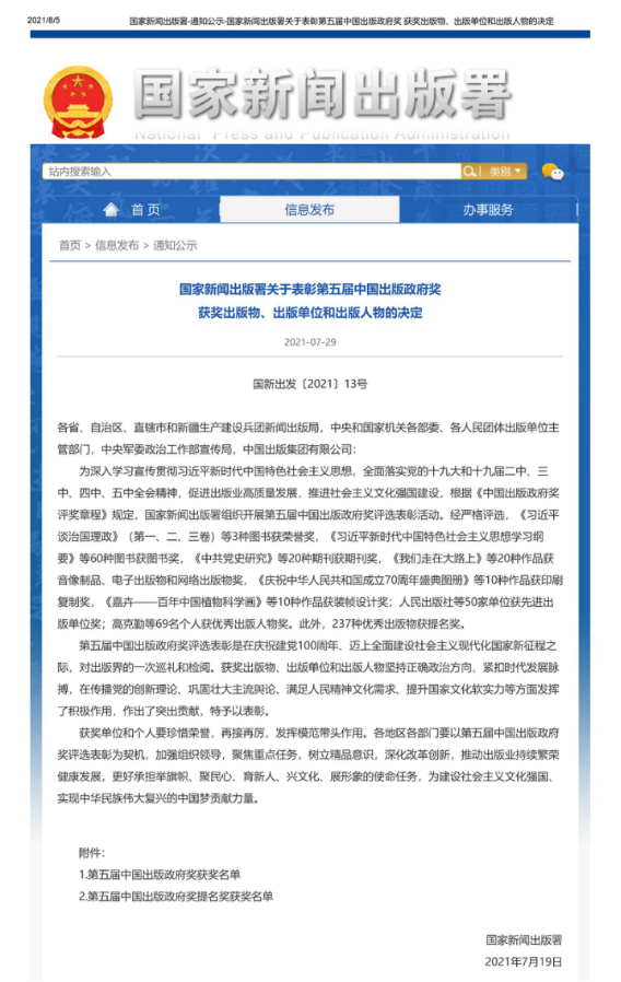 据介绍,中国出版政府奖是我国新闻出版领域的最高奖。该奖评选表彰活动由国家新闻出版署主办,是国家级“三大奖”之一,每三年评选一次,旨在表彰和奖励国内新闻出版业优秀出版物、出版单位和个人。