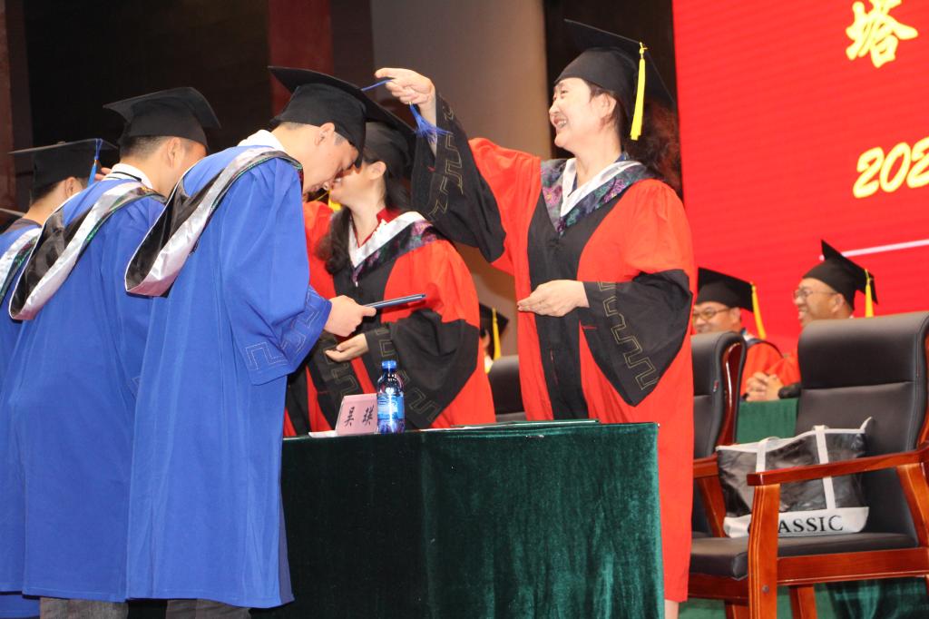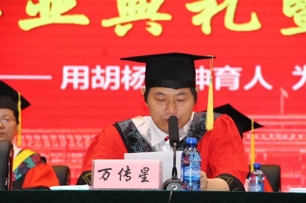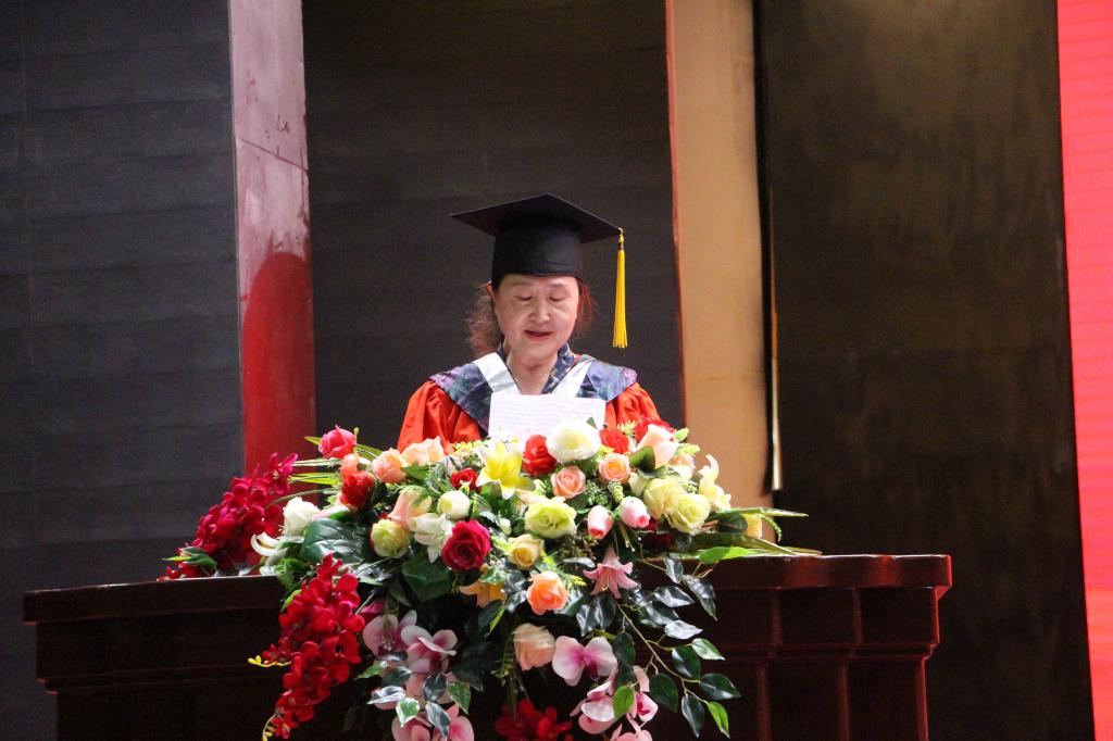 教师代表,化学化工系吴瑛教授发言,希望毕业生们牢记胡杨精神,做有新道德、新思想、新知识的青年,做对社会、对他人有用的人,创造人生的辉煌奇迹,谱写青春的绚丽篇章。
