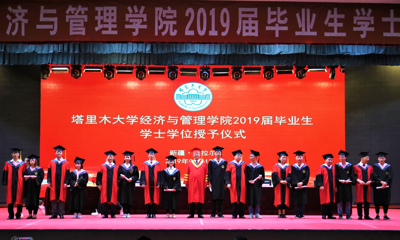 6月12日下午,经济与管理学院举行2019届毕业生学士学位授予仪式。党委副书记、校长张传辉,以及学院领导、南疆经济社会发展研究院负责人、学院党委委员等出席仪式。仪式在行政楼报告厅举行。