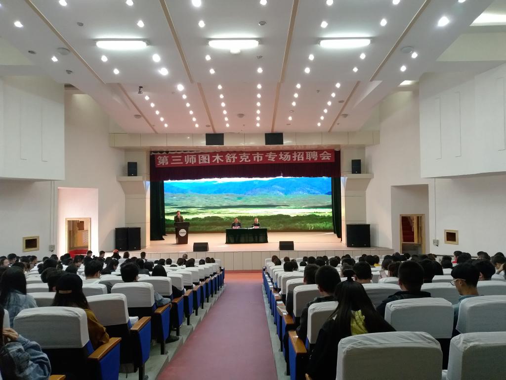 3月13日下午,第三师图木舒克市专场招聘会在beat365大学生活动中心举办。第三师图木舒克市教育局局长刘玉成介绍了该师特岗教师招聘事宜及人才引进待遇、薪资和工作环境,通过宣传视频直观展示了第三师图木舒克市的发展前景,对毕业生进行了现场答疑。