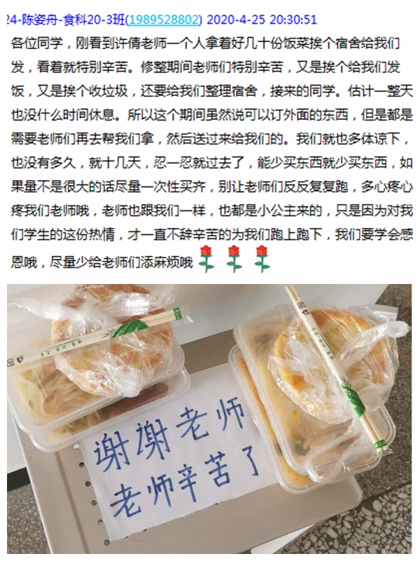 让我们暖心、欣慰的,是住在5楼的学生写在凳子上的“老师辛苦了”,是陈姿舟同学在QQ群里的倡议,是同学们认真贴上的垃圾分类标签……