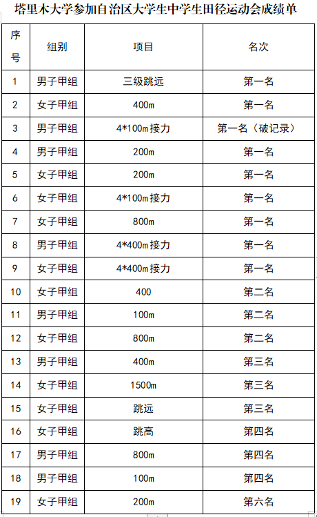 21日,在首个比赛日上,塔大健儿奋力拼搏、驰骋赛场,用青春的热血彰显胡杨精神,用矫健的身姿再现塔大风采。喜获6个项目的8个名次,其中,女子400米包揽冠亚军、男子三级跳获冠军、男子100米获第2和第4名、男子400米获第3名,女子1500米获第3名、女子跳高获第4名,为运动员接下来比赛奠定了坚实基础,提振了继续拼搏的信心。第二比赛日,塔大运动健儿不负众望,努力拼搏,一举拿下男子200米、女子200米、男子4*100米、女子4*100米4个冠军和女子跳远第3名、女子200m第6名的优秀成绩。其中,男子4*100米破大会记录。比赛最后一日,塔大健儿炙热的青春继续点燃,夺得了女子800米冠亚军、男子4*400米、女子4*400米冠军,男子800米第4名。三天的比赛,beat365中文登录入口代表队共获得9个项目第一名,3个项目第二名,3个项目第三名,3个项目第四名,1个项目第六名的好成绩。同时,beat365中文登录入口获得大学甲组团体总分第二名,王军、帅伟获优秀教练员,孟迪获优秀裁判员,唐斌、陈曼瑜获优秀运动员称号。