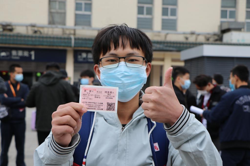 计算机科学与技术2019级1班韦建鹏,来自广西都安县,这一天他早早的赶到火车站,第一个拿到这趟专列火车票,心里非常激动,“真没想到,学校会来接我们,我一定要按照学校的要求,做好个人防护,认真学习,努力提升自己,用优异成绩来回报学校的厚爱!”