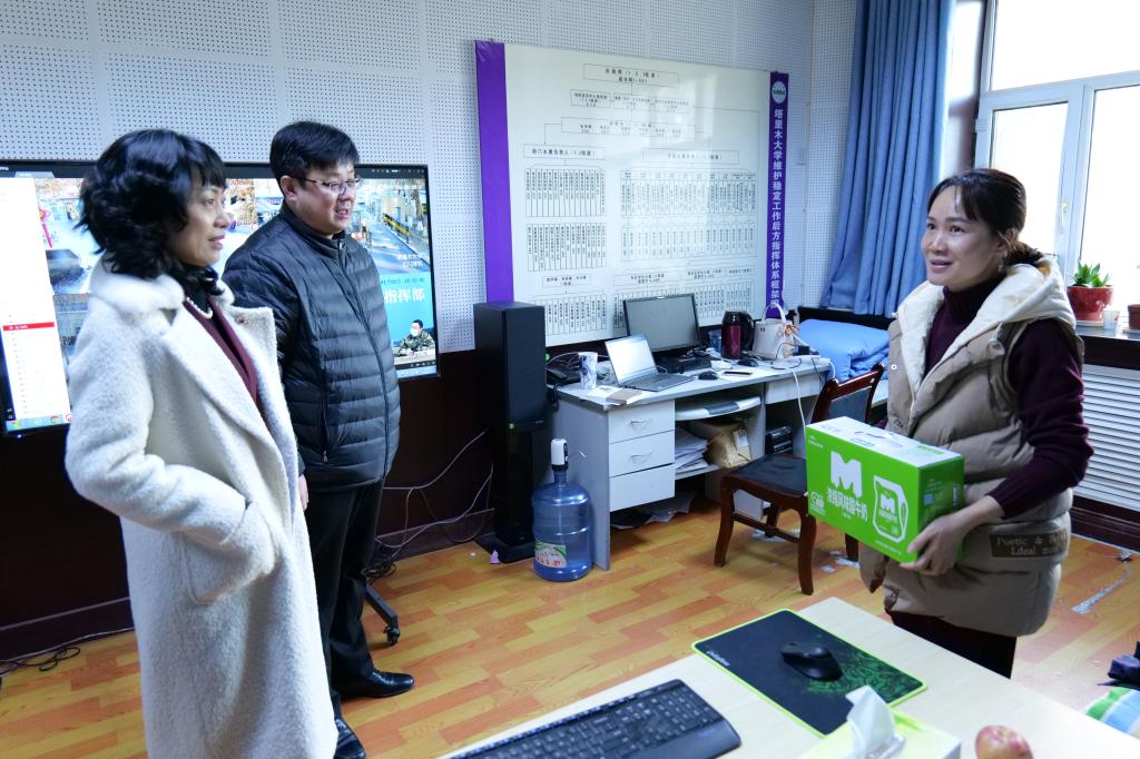 1月1日,党委书记赵光辉,党委副书记、校长张传辉,党委副书记、纪委书记单洪山,党委副书记张爱萍,党委常委、副校长于军,分别来到保卫部、派出所、后勤处、小车队、校医院、疫情防控指挥部、新校区、机关各办公室,看望慰问正在值班值守的干部职工群众,向他们表达诚挚感谢和新年问候。