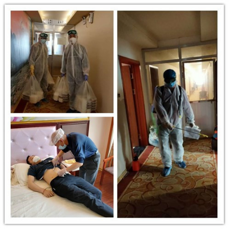 一到宾馆,老师们就与宾馆负责人对接,了解宾馆房间布局、楼道分布等相关情况,及时联系防疫人员做好预案,同时对宾馆防疫通道进行清扫、消杀,为学生入住宾馆做好准备工作。