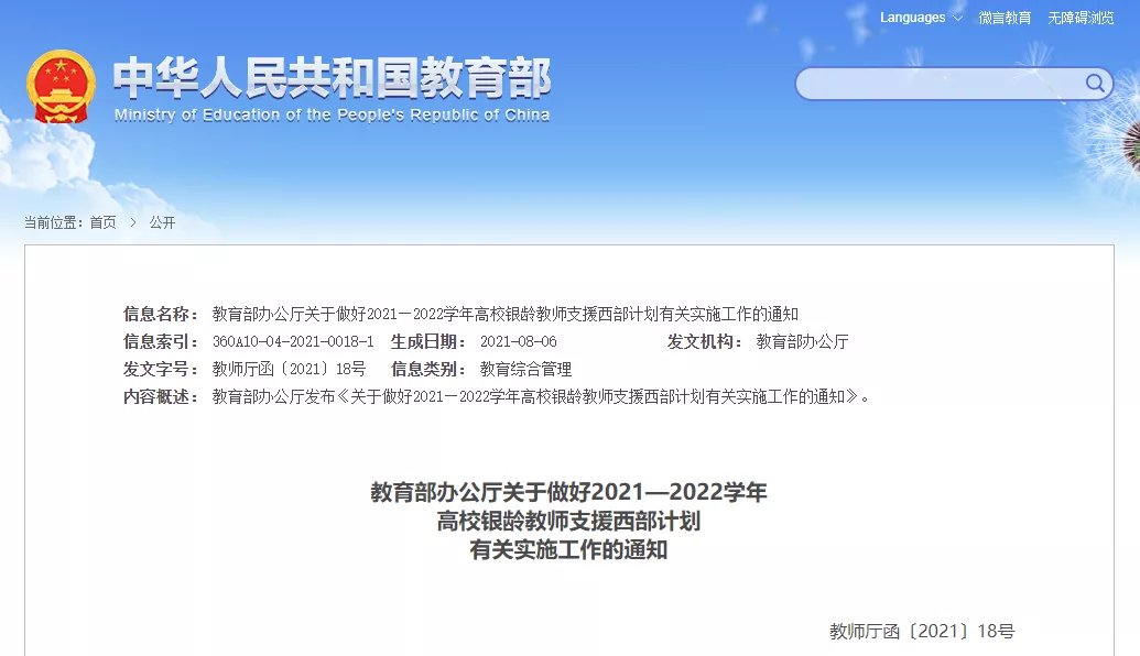 教育部办公厅关于做好2021—2022学年高校银龄教师支援西部计划有关实施工作的通知