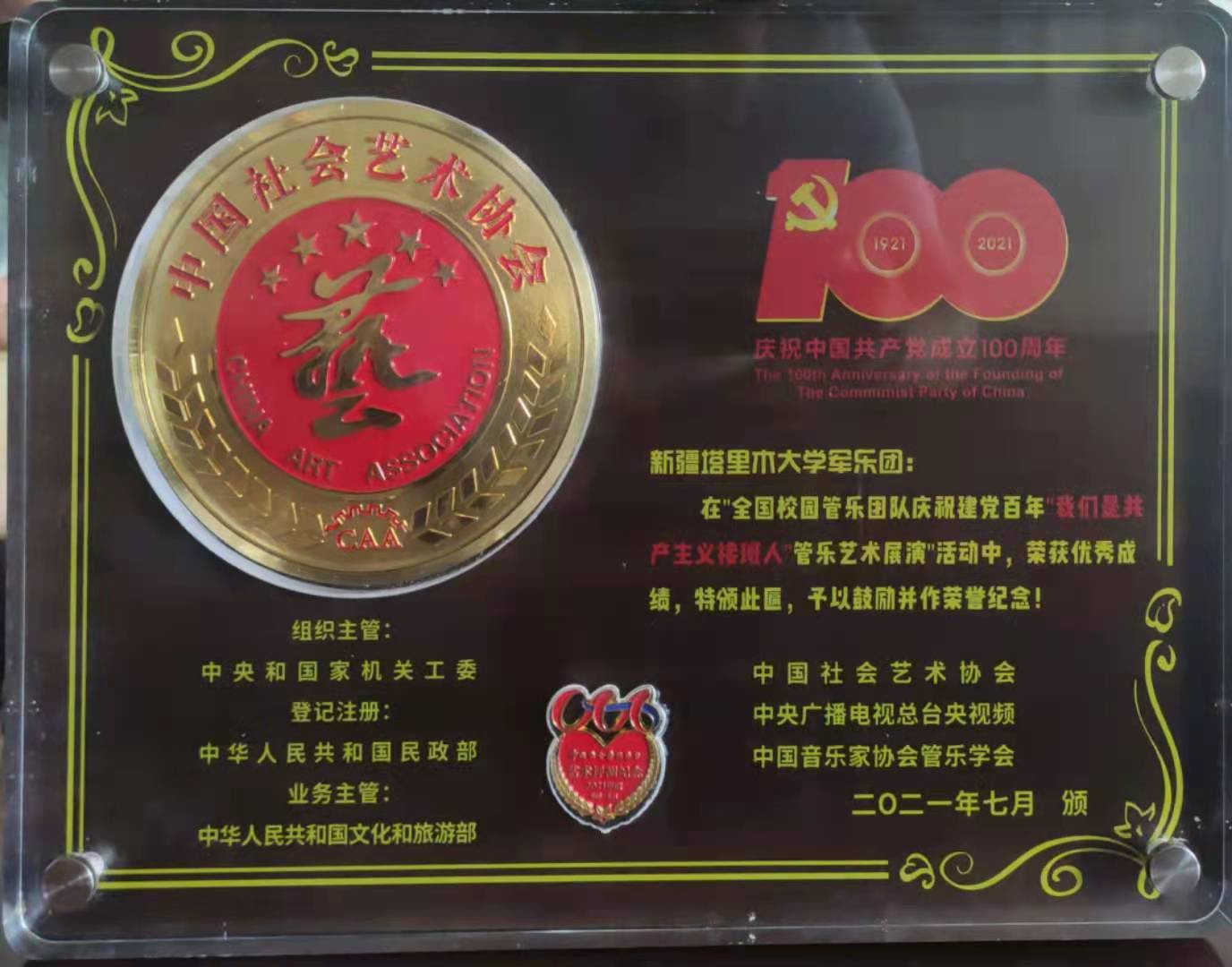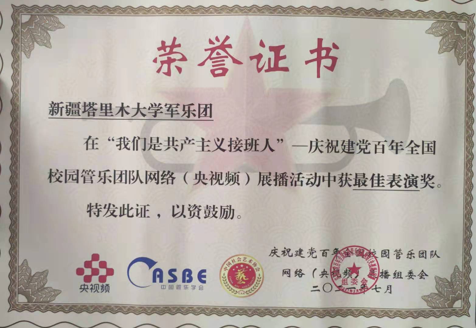 近日,为庆祝中国共产党百年华诞,由中国社会艺术协会、中央广播电视总台央视频、中国音乐家协会管乐学会联合举办的“我们是共产主义接班人”——庆祝建党百年全国校园管乐团队网络(央视频)展播活动圆满结束,beat365军乐团演奏的作品《没有共产党就没有新中国》经过层层选拔与大众投票,最终荣获 “最佳表演奖”,是新疆大中小学当中唯一获此荣誉的管乐团。