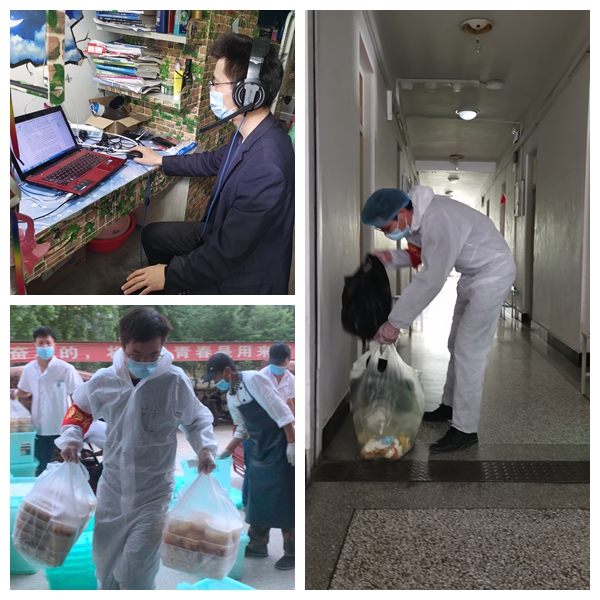 一大早,对讲机里传来,“领饭了!”。胡灿老师穿上防护服和鞋套,戴上口罩、护目镜,下楼为学生取饭。将热乎乎的早饭分发给学生。可谁知道这位青年已经一夜未合眼,只为等待还未到校的学生。