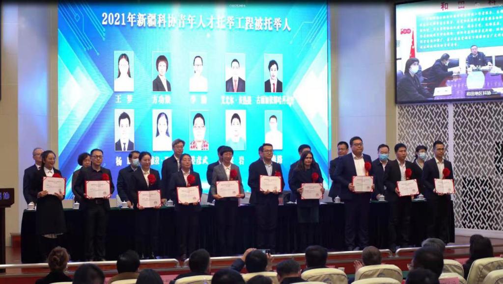 会议最后,尹飞虎、王光强等为20位第十届新疆青年科技奖获得者颁奖,并为首批新疆科协青年人才托举工程的10名被托举人颁发了入选证书。杨昭是首届获奖者中唯一一个兵团入选托举人。