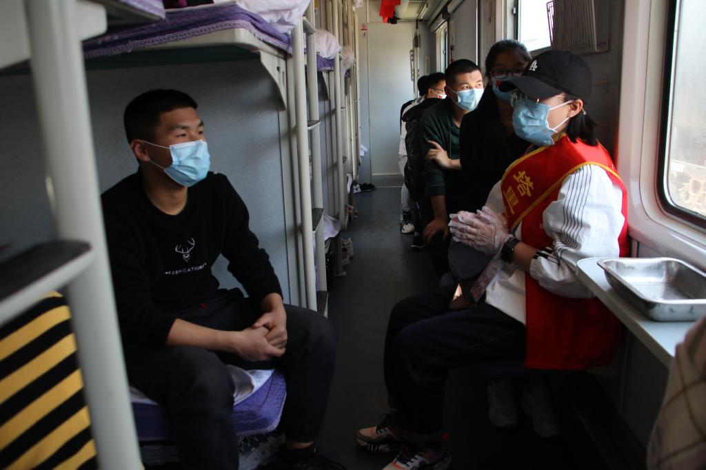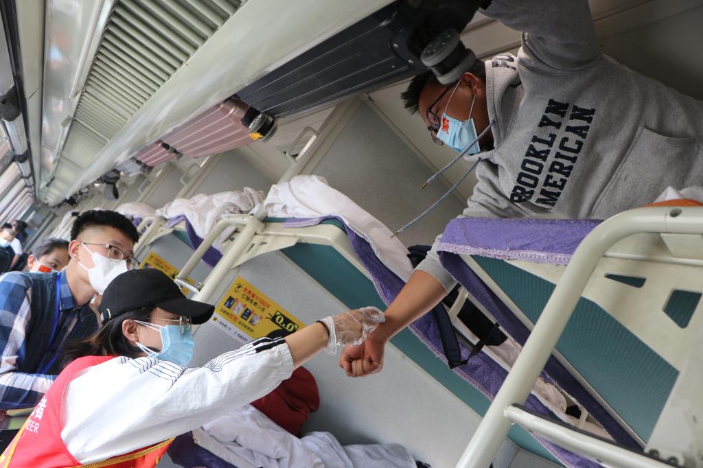 整个12号车厢共乘坐25名塔大返校学生,除了测量体温、分发额温枪和新口罩外,张敏还要细致核对车厢内每一位返校学生的基本信息。由于很多同学休息时间较早,她需要在规定的时间内,小心翼翼地叫醒仍在休息的同学,进行测量体温和核对信息。