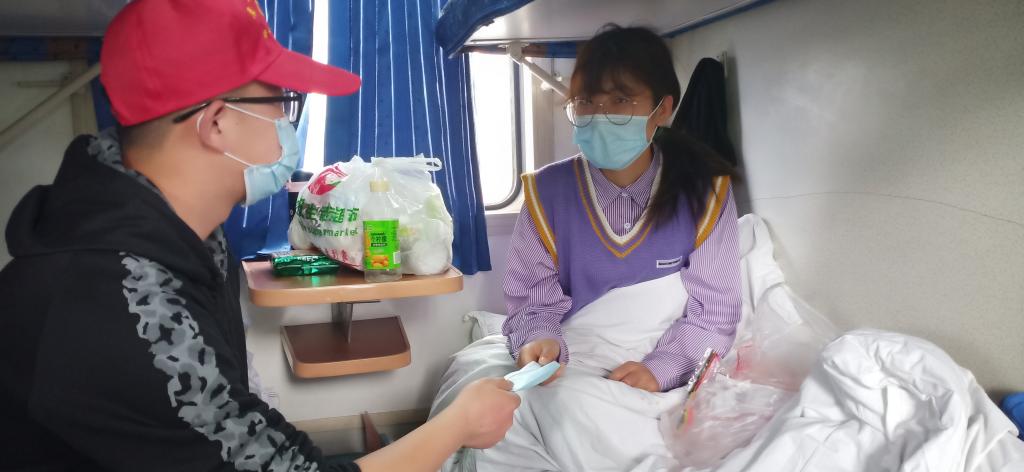 投资学21班王进岗同学,是一名学生党员,也是一名学生干部,他除了统计信息和检测体温外,还和同学们一起聊塔大、聊趣事,让原本枯燥的列车旅途变得更加丰富了。“很开心能成为志愿者,一路上为同学们服务。这一次坐火车比以往所有的旅程都要有意义,值得我们每一个塔大胡杨学子永远牢记。“王进岗同学说。