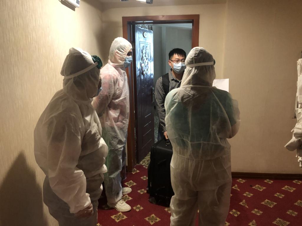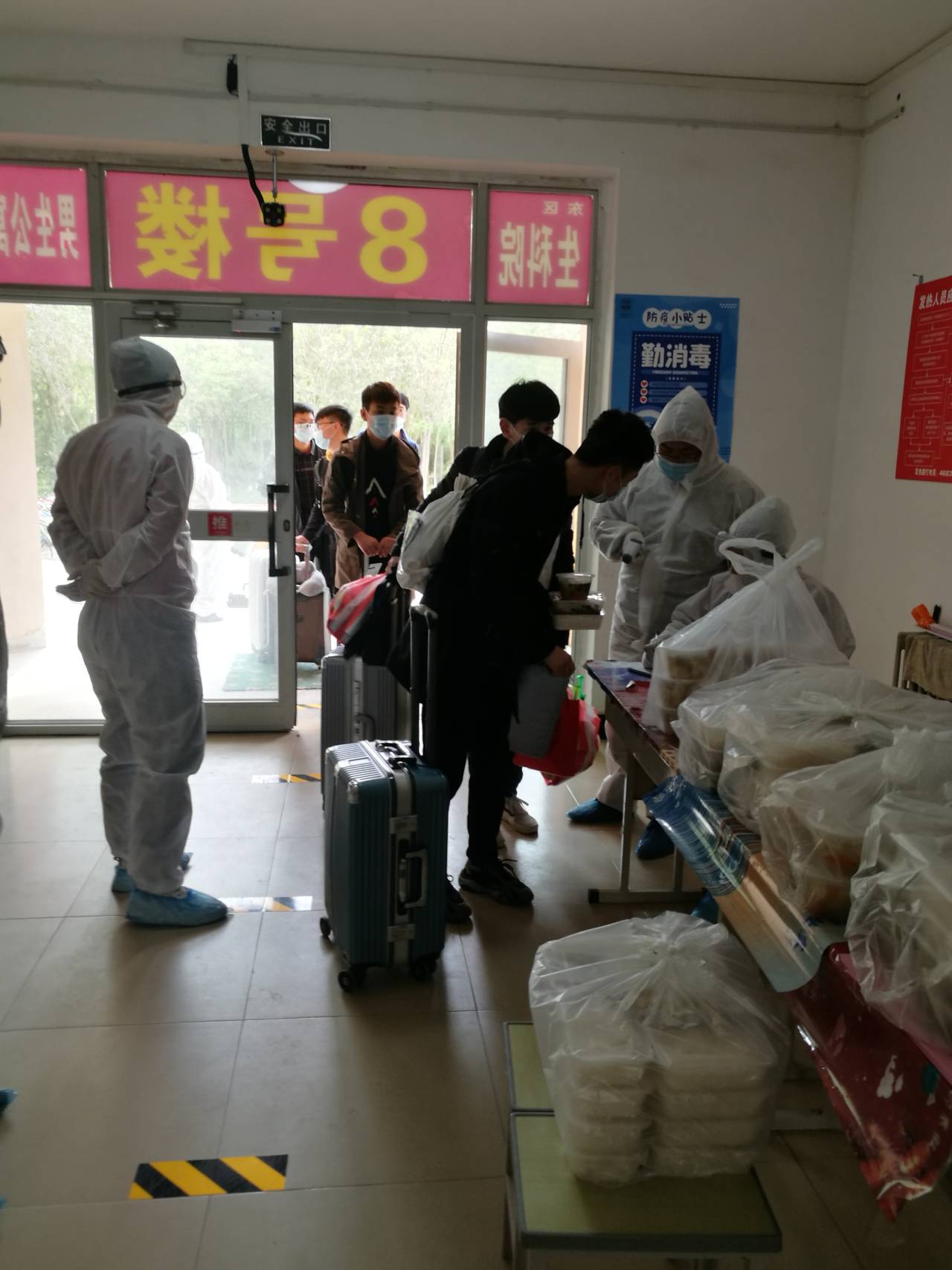 当我走到宿舍楼下时,就看到老师们已经站在那准备好消毒了,给我们测量记录,为我们消毒。每层楼都有专门的老师照顾我们,指引我们洗澡、上卫生间,对我们的关心无微不至。