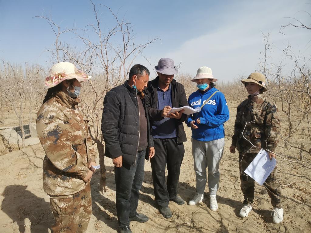 林敏娟在皮山农场4连指导职工开展枣腐烂病的预防技术 |