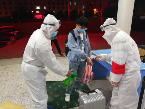 “同学,一路辛苦了,欢迎回家。身体有没有感觉不适的地方?最近这几天体温有没有异常?楼层负责老师已经帮你收拾干净宿舍卫生,打好了开水,还为大家准备了免费餐食,老师忙完后会给你送过去……。”4月22日,学校东区10号男生楼,动科院楼层长刘书东老师和钱文熙老师,正忙着为返校学生进行健康情况详细登记,并为每名返校学生发放学院事先准备好的生活用品大礼包、口罩和体温计等必需品。