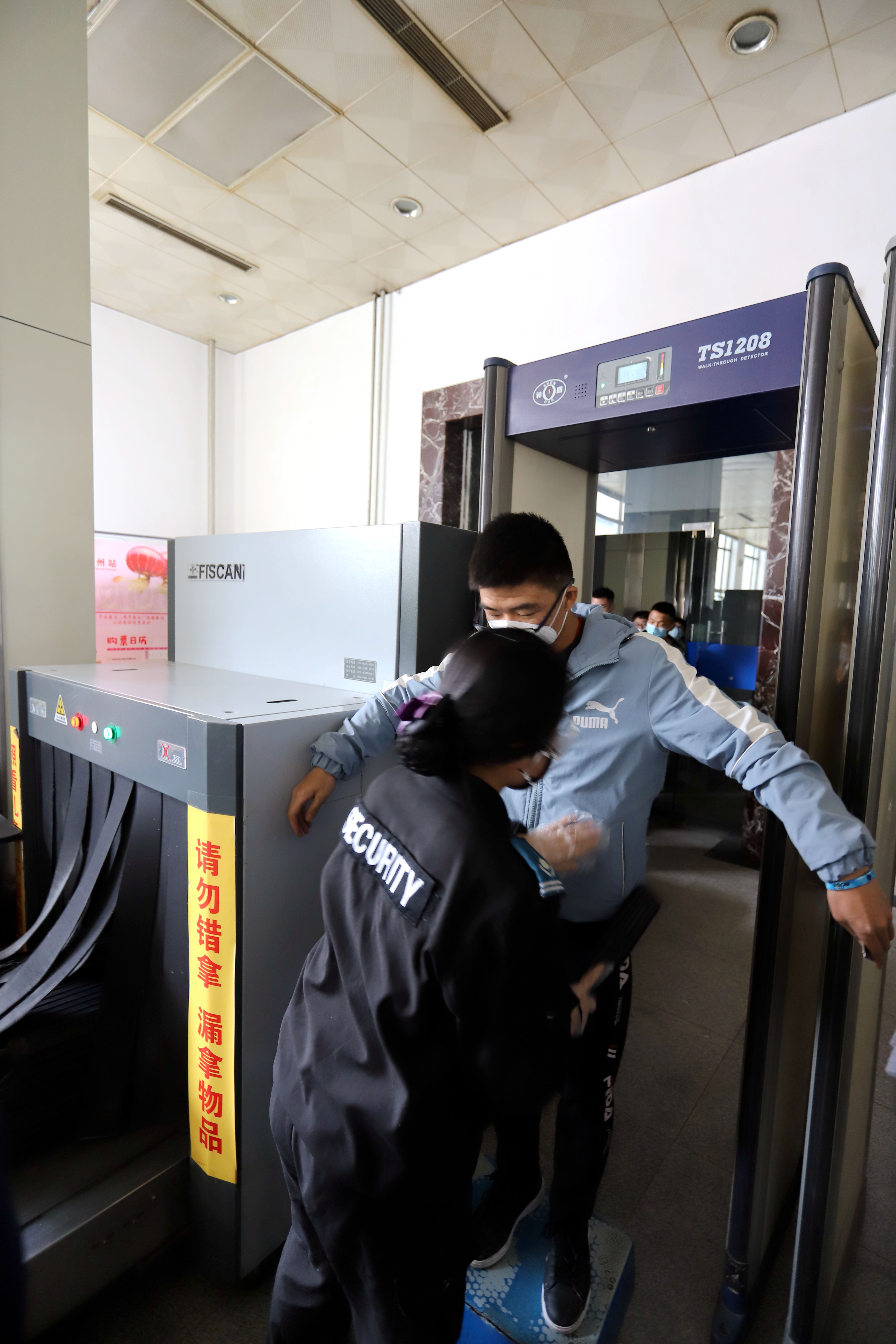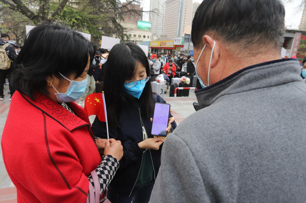 14:50,学生们进行体温检测后,按照所在车厢号排队,从绿色通道有序进站上车。