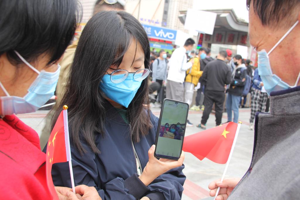 13时许,一场爱国主义教育“仪式”举行,歌声响彻火车站广场上空。同学们整齐站在火车站广场,手举小红旗,齐声高唱《我和我的祖国》《光荣塔大》,为祖国加油、为塔大点赞,难掩内心的兴奋和激动。