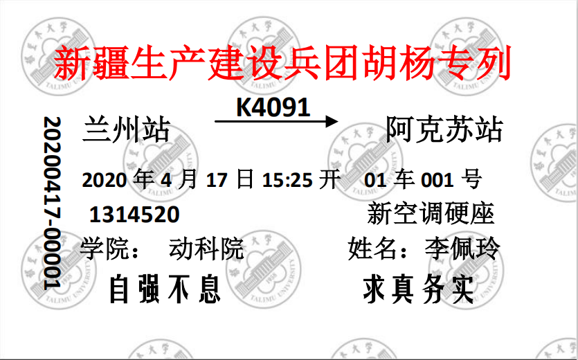 4月17日15:25,首趟兵团胡杨专列(K4091次),从兰州火车站出发,开往阿克苏站,1086名塔大学子搭乘此次列车开启了返校温馨之旅。