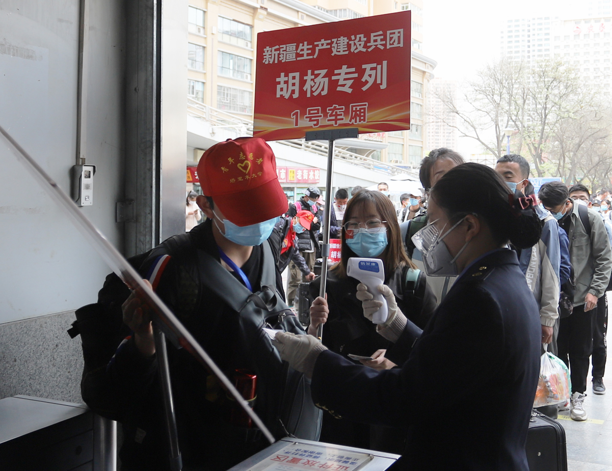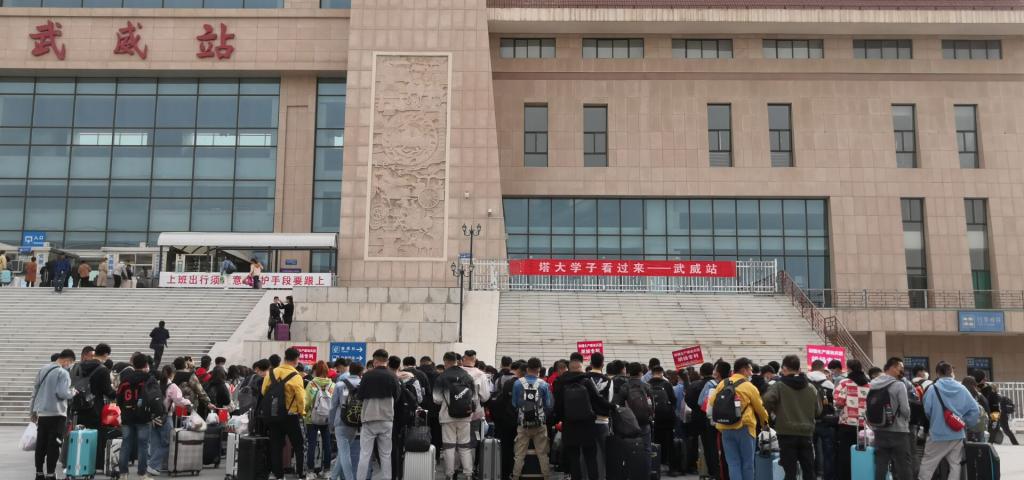 在兰州站广场上,“新疆生产建设兵团胡杨专列”,标牌十分鲜亮;“疫情无情人有情,塔大专列来接胡杨学子回家了!”“返校复课,胡杨专列为您保驾护航!”,横幅非常醒目。