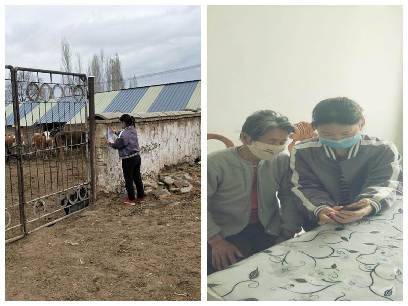 家在塔城市阿布都拉乡的金敏同学(牧医专20)专门来到刚刚获得创业补贴优惠政策的个体养殖牛场,向他们讲解我国动物检疫、屠宰、经营、运输、疫病的防控、人员消毒等一系列法律法规的内容,希望农户切身保护自己利益的同时降低其他方面造成的损失,一切以预防为主,尽快找差距、补短板,做好免疫预防工作,金敏同学专门在养殖场大门张贴宣传动物出入场的检疫程序,方便他们执行相关规定(图7)。金敏同学在阿布都拉乡饲养生猪存栏量为60头的老人利用手机App通过二维码扫秒和识别真假兽药的方法(图8)。